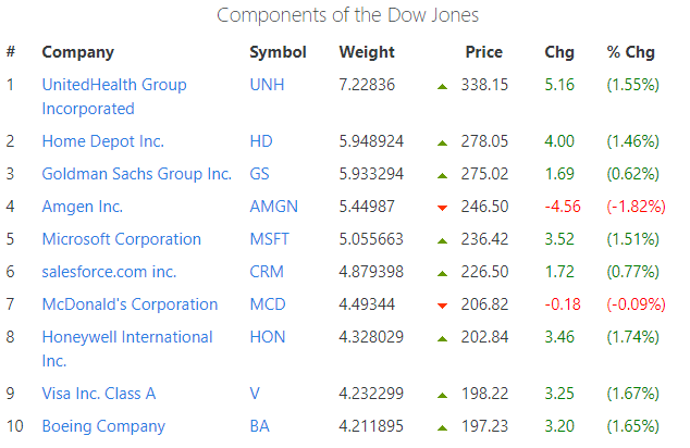 可以看出,道琼斯的前十大权重股,只有微软(MSFT)与纳斯达克和标普500指数重合,其它都是不相同的股票。这也意味着,道琼斯的整体走势,与另外两支股票指数的走势会出现一定程度的差异。虽然权重股不同,但权重的畸形分配是一样的。道琼斯工业平均指数的前十大权重股的总和权重为51.76%,同样的,机构想要让股票指数走势变得漂亮,根本没必要在意剩下的几百只股票,只要买入这十支权重股就可以。