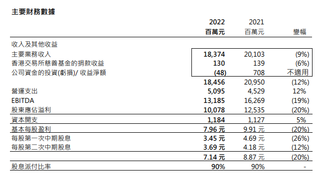 连同2022年9月派付的第一次中期股息每股3.45 元,港交所去年全年股息为每股7.14元,按年跌20%,派息比率为90%。以现价计,股息率约为2.1厘。