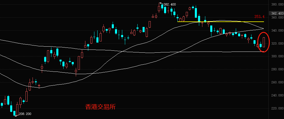 技术角度看,今年1月10日以来,香港交易所的股价持续回调,1月18日~27日虽然经历短暂反弹,但并未突破前期高点,弱势格局已定。今日虽然实现强势上涨,但回调结构未改,不可盲目看多。上方关键阻力位是353.4元,如果未来一周市场价格突破该阻力位,并且继续上行较大空间,则回调结构被改变,中期多头趋势有望延续。另外,今日恒生指数大涨,股票市场整体信心较为旺盛,有利于香港交易所股价短期反弹。