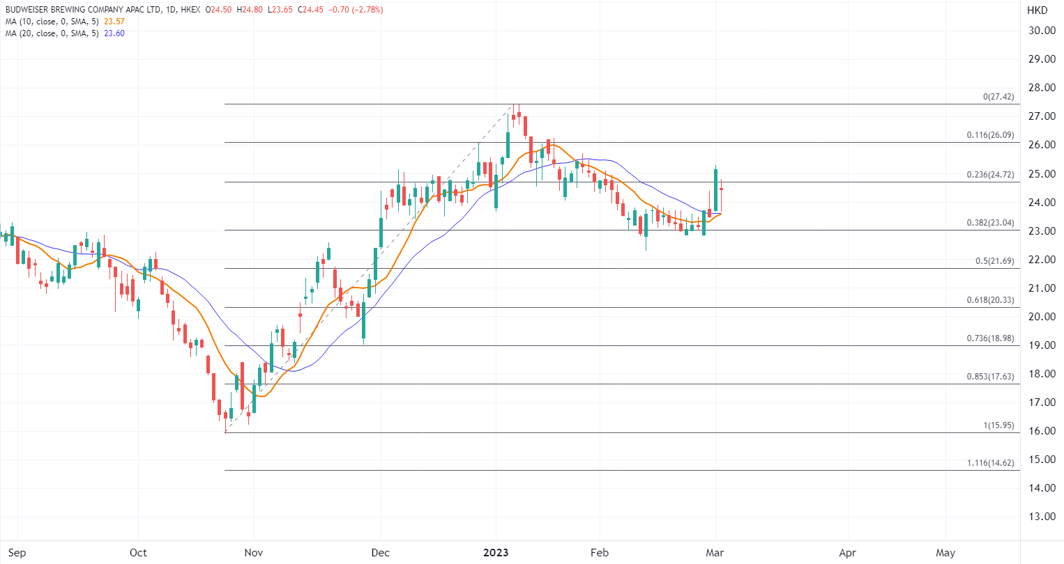 接下来关注啤酒股业绩期集中,对于今年业绩的展望可能成为亮点,不过考虑近期部分啤酒股走势已经偏强,如果业绩不及预期可能触发调整。华润啤酒(01876.HK)近期获得机构上调目标价,昨日大涨7%后日内有回吐压力,当前留意均线集合在23.60港元的支撑。如果接下来有业绩利好跟进,可以看向26港元甚至挑战1月高位在27.42港元高位。