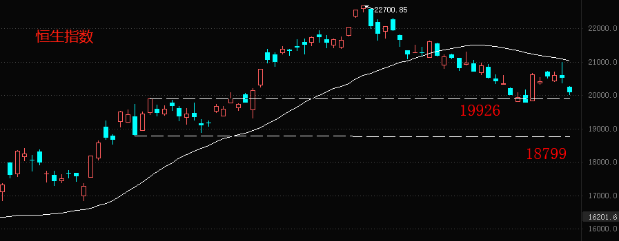 由于恒生的互联网板块中的大部分个股都在港美两地同时上市,所以恒生指数受到美股市冲击的概率较高。截至今日10:16,HSI跳空下跌2.12%,悲观持续蔓延,银行、互联网、地产等权重板块纷纷走弱。恒数最新市场价格20064点,至今日收盘有可能失守两万点整数关口。