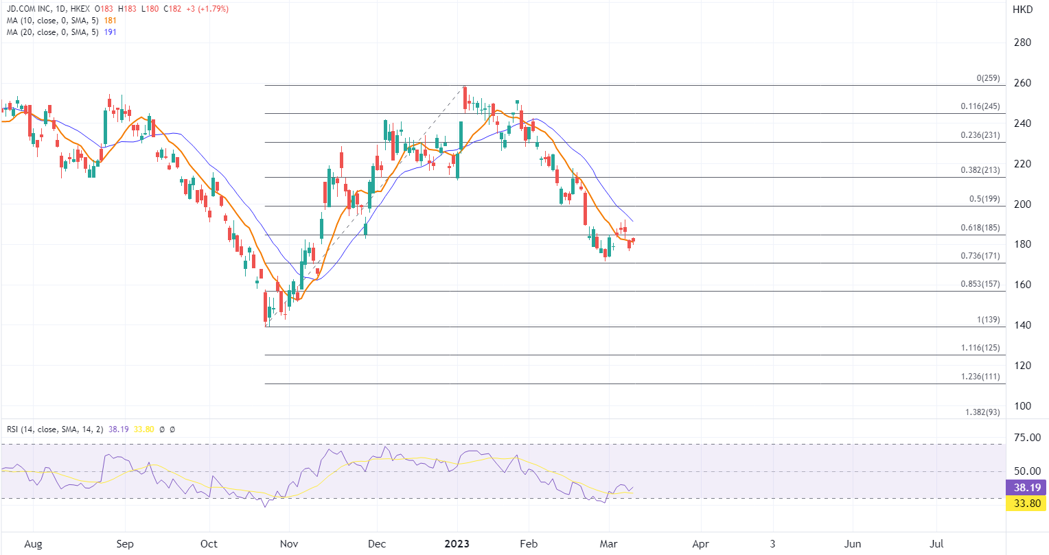 ATFX指,今日京东股价在绩前高开,表明市场对业绩持期待的态度。去年第四季度后期,中国防疫放宽后带来积极的需求推动,作为京东主要利润来源的零售业务将明显受惠,可以支撑京东期内净利润的增长。