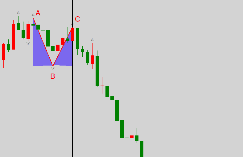 AB的倾角和BC的倾角(图中浅蓝色区域)不能太小,以45度为宜。当然,K线图中的角度会随着坐标轴的放大缩小而变化,这里给出的45度标准只是主观标准,实际操作中还需要交易者自行复盘体会。角度过小,代表多空争夺剧烈,谁占上风还没有定论。角度过大,代表市场发展温和,多空主力还没有碰头,参与价值较小。