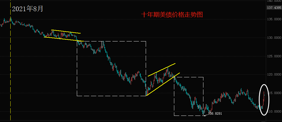上图是芝加哥商品交易所(CBOT)十年期美债期货当月连续价格走势图。2021年8月份以来,美债价格持续下跌,最大跌幅近20%,市场价格从135左右回落至108。如果美国的银行在2021年下半年和2020年买入了大量美国债券,必将遭受巨额损失。国际买家,比如中国的人民银行和日本央行,也将遭遇类似困境。最近四个交易日,美债期货价格有快速反弹的迹象,但是尚未突破年内高点,此时判断美债期货已经筑底为时过早。毕竟,3月23日的美联储利率决议大概率仍将加息25基点。加息意味着美债价格仍将走低。
