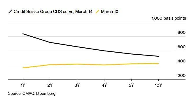 ATFX国际:银行业的风险暴露事件可谓一波未平一波又起。先是美国硅谷银行遭到储户和投资人的挤兑,落得破产倒闭的下场。幸亏有美国财政部、美联储、美国联邦存款保险公司(FDIC)的联合救助,美国总统拜登的承诺,所有储户才能够拿到自己的存款。硅谷银行的事件尚未平息,瑞士的第二大银行——瑞士信贷,波澜再起。昨日,瑞士信贷突然宣布要向瑞士国家银行,也就是瑞士中央银行,申请500亿瑞士法郎的借款,用来补充自身的流动性。信用互换市场早在本周二就已经发出了危险信号:瑞士信贷债券的一年期信用违约互换(CDS)在收盘时报价835.9,远高于常态化水平,意味着债券违约的可能性极高。