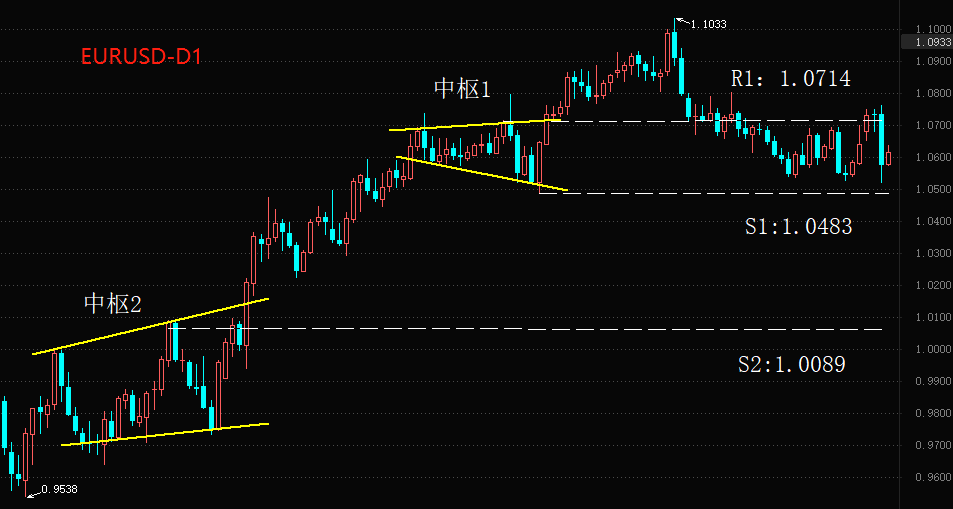 由于瑞士信贷在欧洲的金融系统中影响力巨大,在其曝出流动性问题之后,欧元的币值受到重大冲击。欧元兑美元单日跌幅高达1.46%,市场报价一度跌破1月9日以来的最低点。技术角度看,欧元兑美元的回调波段已经和震荡中枢1重叠,这是趋势转折的典型信号。如果未来市场价格跌破S1:1.0483,那么空头趋势的形成将得到确认。