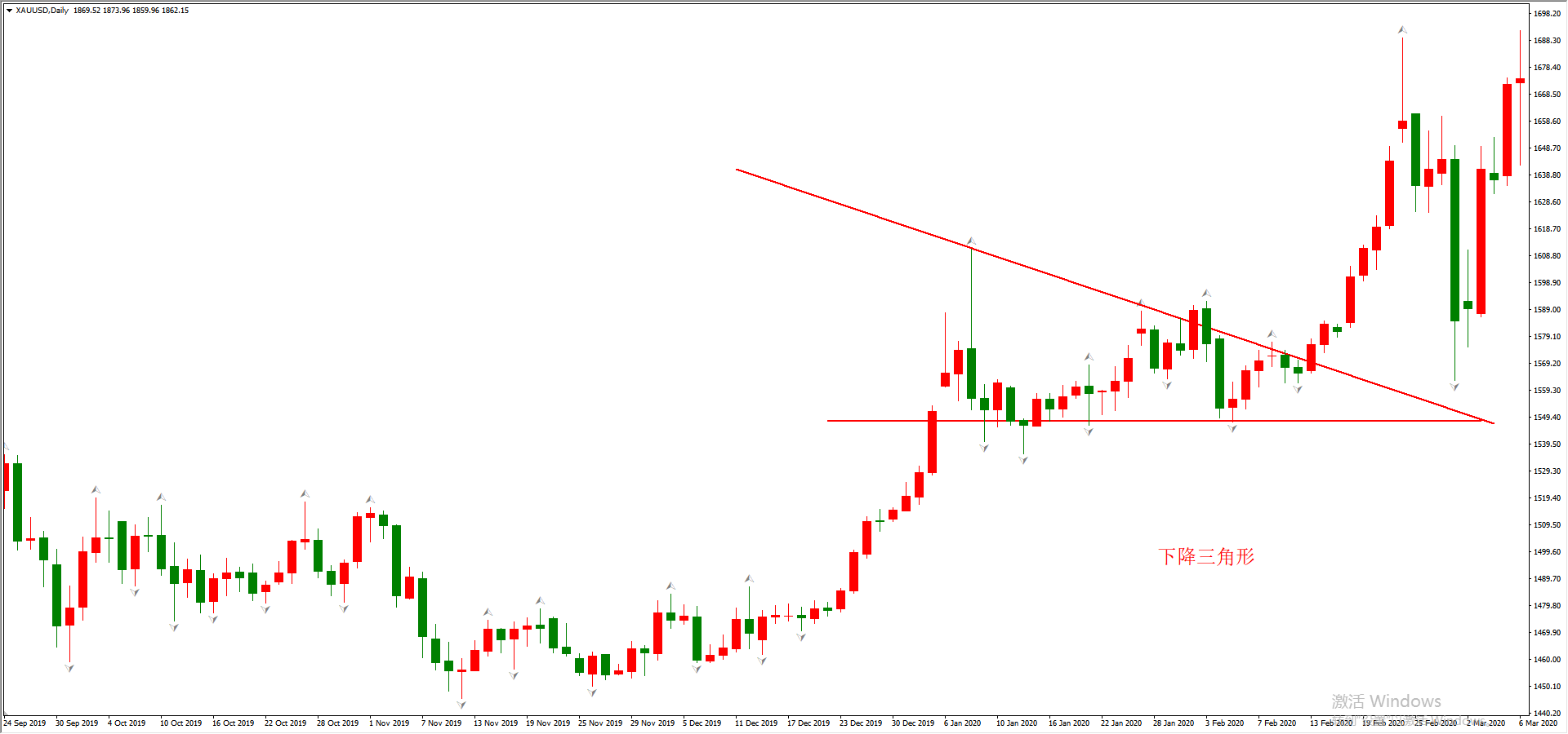 三角形上方的直线,由两个价格基本相等的顶分形连线形成。对于“基本相等”这个概念,无法用定量的方法给出定义。设定两个顶分形相差10标准点、20标准点、50标准点等等,这些数字都不够准确。交易者需要领会其精神主旨,通过大量的复盘和丰富的交易经验来自己参透“基本相等”的定义。三角形下方的直线,由依次抬高的两个底分形连线形成。三角形上方的线和下方的线延长后相交于某点,如上图。