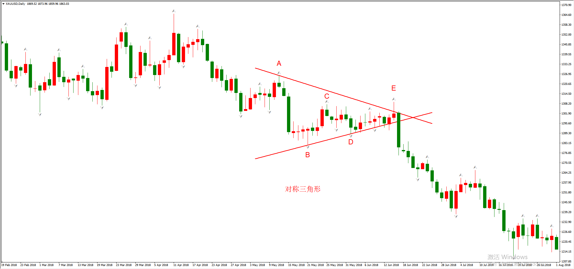 对称三角形的上方阻力线,由连接两个依次降低的顶分形构成;下方支撑线由连接两个依次升高的底分形形成。并且,依次抬高和依次降低的幅度要“基本相等”。阻力线和支撑线的延长线相交于与一点,如上图,ABCDE五个点构成对称三角形。实际上,只需要四个点就可以形成一个对称三角形,只是实际行情千变万化,由更多点构成的三角形经过简化后也可以成为对称三角形。比如,ABCD四个点就可以画出对称三角形,只不过这样的对称三角形随着行情的发展证明是无效的,因为没有出现“长阳线/长阴线”来进行突破的确认。只有将E点纳入考量,并画出新的阻力线,才能够获得有效对称三角形。这种“修正”工作是必要的,因为谁都无法保证我们最初画出的三角形形态一定能够在未来有效。交易者能做的,就是尽自己最大的努力,避免频繁修正形态。