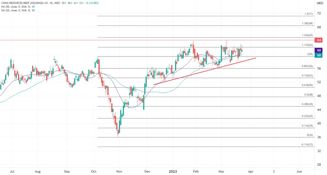 明日(3月24日),华润啤酒(00291)将公布业绩,可关注高档板块的销量增长加快,如果业绩超预期,展望股价有望挑战自1月底以来的主要高位阻力在64港元,当前技术关键支撑在均线集合所在的60港元关口。