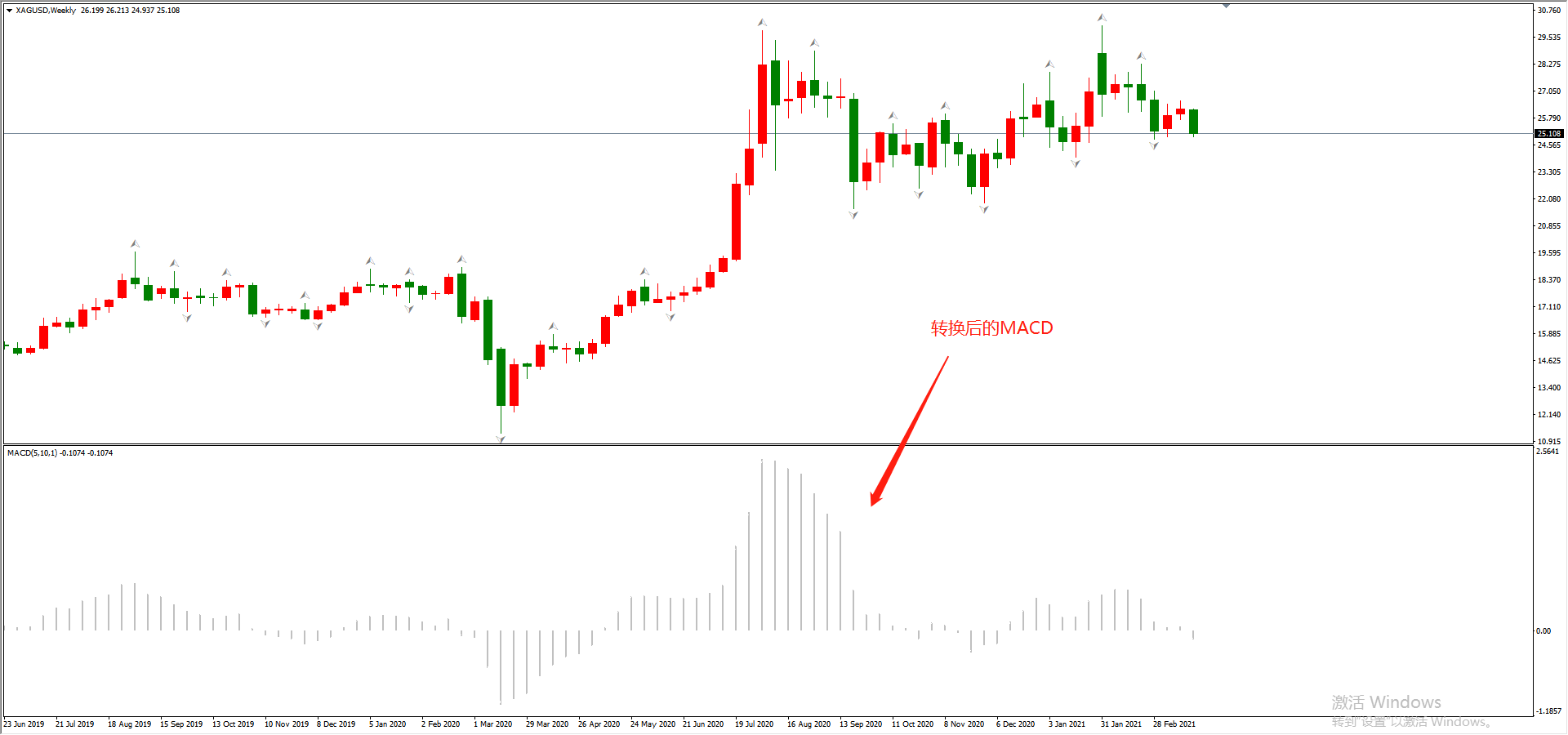 ATFX科普:普通的均线在主图显示,但由于笔者更倾向于在主图上进行结构化分析(勾形+通道),所以将主图上的双均线指标转换为副图指标。转换的基础就是MACD。将MACD的三个参数修正为(5,10,1),指标图中就只剩下了柱状线和与柱状线紧密连接的曲线。将曲线的颜色调整为与背景色一致,这样就能够起到隐藏曲线的作用。最后,MACD线变成了表示MA5和MA10两条均线差值的柱状图。如下图所示: