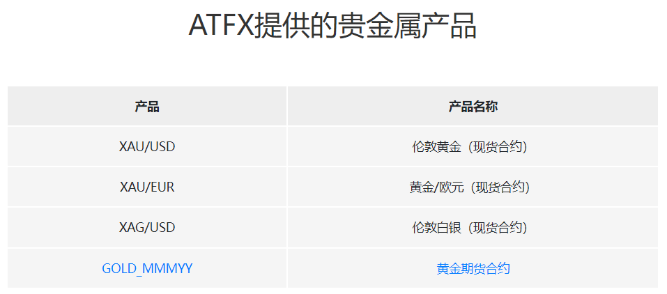 目前,ATFX为投资者提供包括货币对、贵金属、能源、股票、指数、ETF在内的超过三百种差价合约产品。在贵金属产品表单中,平台亦是提供XAU/USD(伦敦黄金现货合约)、XAU/EUR(黄金/欧元现货合约)、XAG/USD(伦敦白银现货合约)和GOLD_MMMYY(黄金期货合约)四种黄金系列差价合约产品选择。