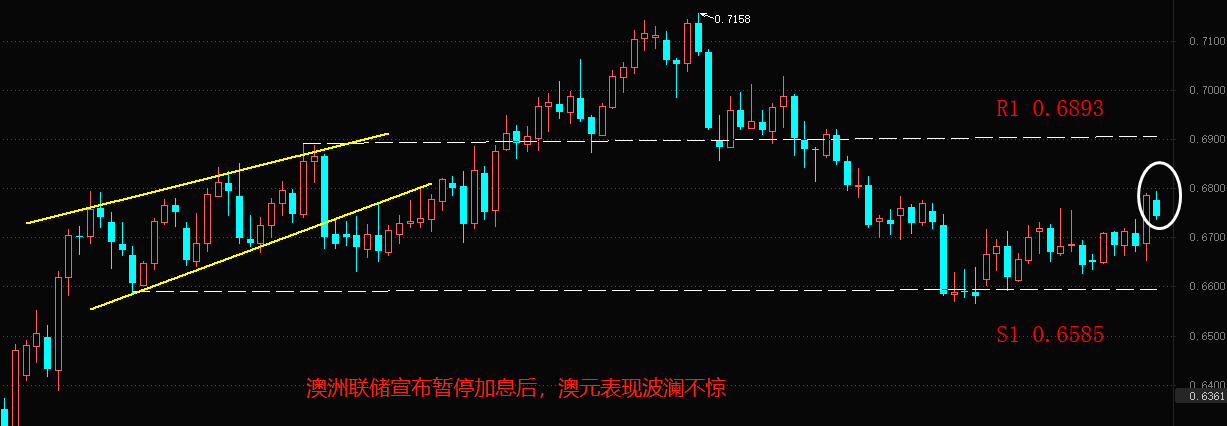 今日12:30,澳洲联储宣布利率决议结果:维持3.6%的基准利率不变。澳洲联储主席洛威表示:“货币政策的运行具有滞后性,大幅提高利率的全部效果尚未显现。总体来看,通胀正在放缓。澳大利亚银行体系实力雄厚,资本充足,流动性强。一系列信息表明,澳大利亚的通胀已见顶。失业率处于近50年来的最低水平。”洛威的讲话基本体现了此前的市场预期。消息公布之后,AUDUSD短线下挫20基点左右,幅度并不算大,市场表现相对平静。客观来说,澳洲联储6.8%的通胀率并不算低,最起码比美国的通胀率高,但只要通胀下行趋势确立,澳洲联储就敢于暂停加息。欧美国家银行体系的流动性危机也给到了澳洲联储警示:过高的终端利率会导致金融资产价格下跌。