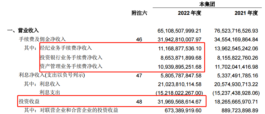 业务角度看,手续费及佣金净收入占到营业总收入的一半左右,其中经纪业务,投资银行业务和资产管理业务贡献的营收份额基本相同。三类子业务当中,只有投资银行业务实现了正增长,其他两项业务均微幅下降。中信证券自营的投资收益高达319.69亿元,相比2021年的182.65亿元增加了75%,表现超出预期。