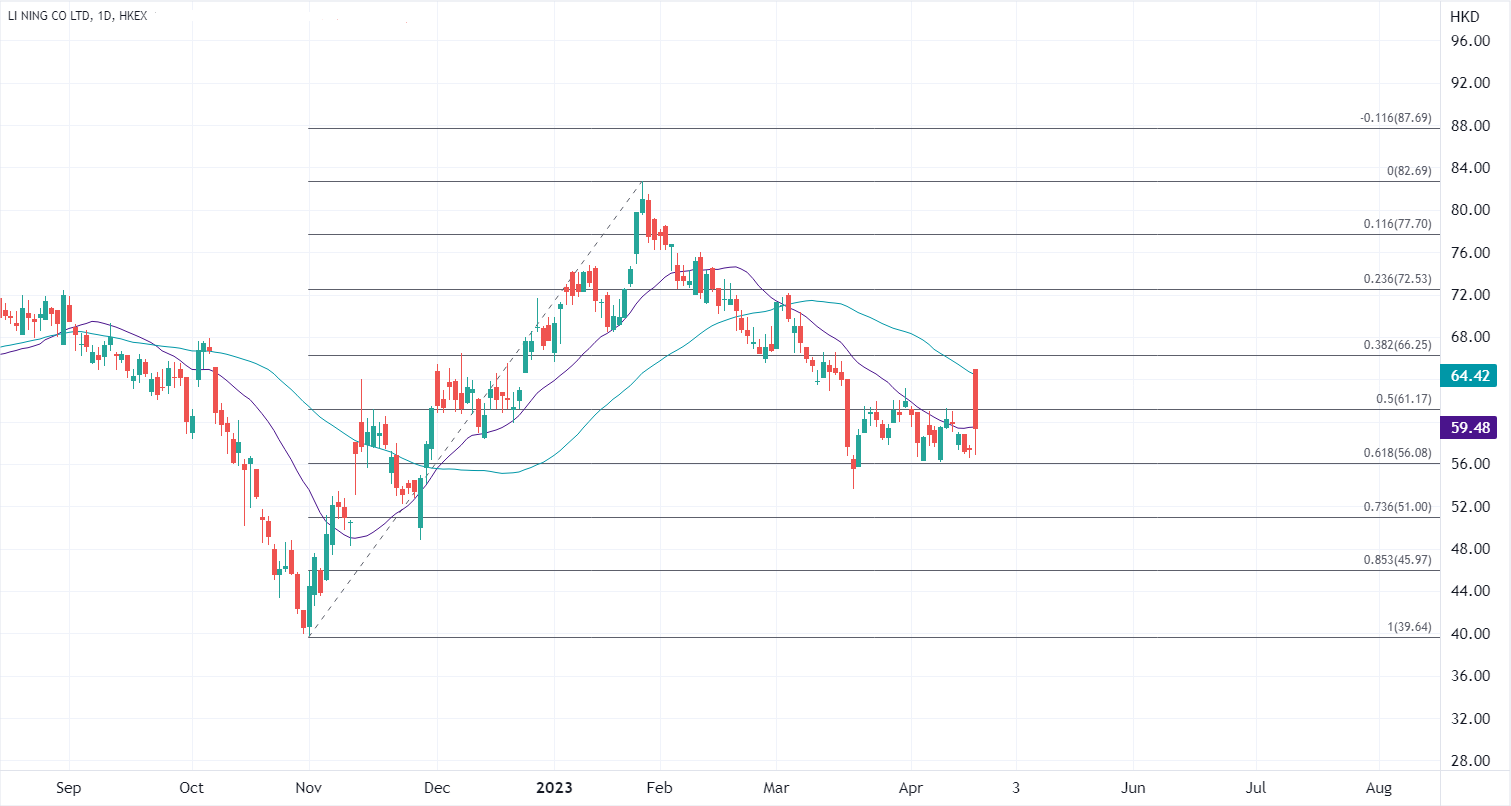 ATFX港股:今早李宁(02331)股价随业绩大幅高开13%,其后随大市沽压回吐,盘中跳水但仍保留逾3%的涨幅,为盘中表现最佳的蓝筹。