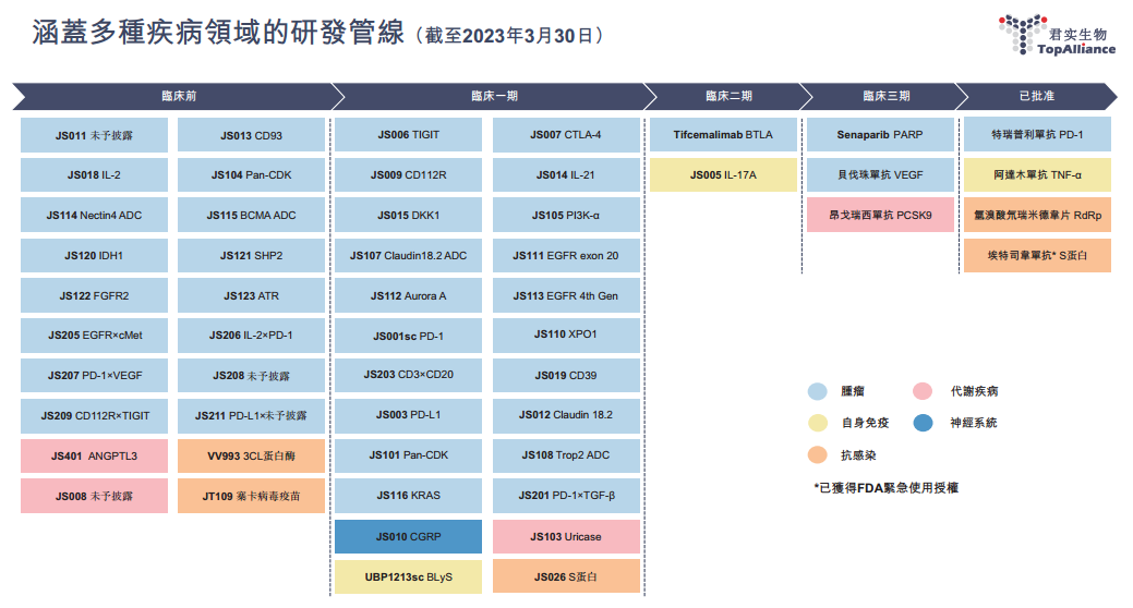 君实生物的核心产品是特瑞普利单抗(JS001,商品名:拓益®),其是国内首个获得NMPA批准上市的国产抗PD-1单克隆抗体,已在国内获批6项适应症,分别为用于治疗既往标准治疗失败后的局部进展或转移性黑色素瘤。2022年,拓益的销售收入为7.36亿元,较2021年同期增加约79%。核心产品的高营收增速,代表君实生物在生物制药赛道的成长性仍比较强。另外,2022年君实生物研发投入为23.84亿元,同比增加15%,研发投入总额超越营收总额,可见其对技术创新的重视程度。作为对比,同属于生物科技行业的康希诺生物,在2022年的研发投入为7.9%亿元,同比下降12.7%。比较来看,君实生物更胜一筹。