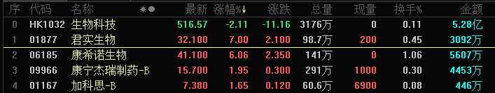 截至今日11:40,港股市场生物科技板块指数的跌幅为2.11%,表现逊于君实生物,表明后者在行业内具备更强的抗跌属性。今日实现大涨的版块内个股还包括:康希诺生物(6.06%)、康宁杰瑞制药(1.95%)、加科思(1.65%)等等。