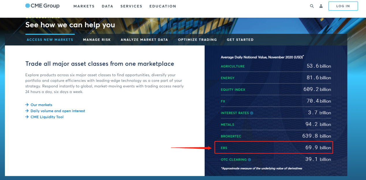 EBS英文全称Electronic Broking Services,中文直译为电子经纪服务,该平台由多家全球最大的银行作为合伙企业创建,成立日期在1990年,最初的目的是为了完善银行间外汇电子类大宗交易。在过去的三十年,EBS几经易手,先是与BrokerTec合并,成立了EBS BrokerTec,之后更名为NEX Markets,最后在2018年被芝加哥商品交易所收购,成为其宣传自己外汇交易实力雄厚的一杆