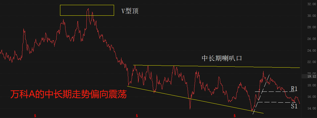 万科A的总市值为1766亿人民币,位居房地产开发板块之首。纯技术角度看,2021年7月份以来,万科A走出了喇叭口的中长期形态。2022年11月和12月的反弹,虽然持续时间比较,但仍未突破喇叭口的上限。中短期来看,万科A的股价仍将下跌寻底。