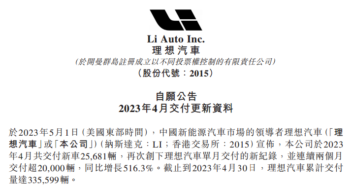 ATFX港股:5月1日,理想汽车发布四月份交付量数据:共交付新车25,681辆,再次创下理想汽车单月交付的新纪录,并连续两个月交付超20,000辆,同比增长516.3%。截止到2023年4月30日,理想汽车累计交付量达335,599辆。不出意外,理想汽车再次成为造车新势力当中的销量王者。