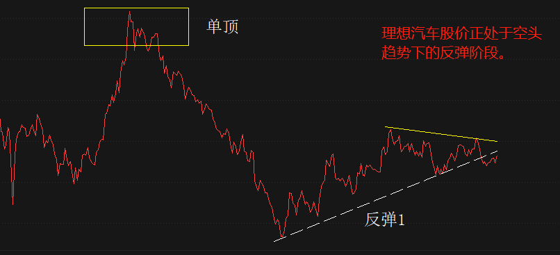 纯技术角度看,理想汽车的股价正处于空头趋势下的反弹阶段。2022年6月份形成单顶结构,终结了此前的多头趋势,并随即展开跌势。2022年7月份至10月份,理想汽车的股价一直处在单边下跌的状态。2022年11月份开始,反弹行情启动,至今的累计反弹幅度已经超过50%,市场价格也从60港元附近涨至90港元附近。反弹终归会遇阻回落。图中黄色下降趋势线已经提示:短期内理想汽车股价存在下行压力。可以将100港元看做重要阻力位,如果股价重新站上100万元,则维持看多态度。如果股价一直在100港元以下波动,则维持看空态度。