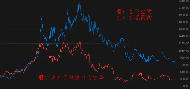 生物制药板块排名第二位和第三位的上市公司分别因为智飞生物和长春高新,两者的股价走势与百济神州大为不同。2021年6月份开始,两家上市公司的股价就进入下跌状态,截至目前仍未寻得有效支撑,空头趋势延续。百济神州已经转涨,而智飞生物和长春高新仍处跌势,可见创新药板块的龙头个股具有显著的抗跌属性,值得长期关注。