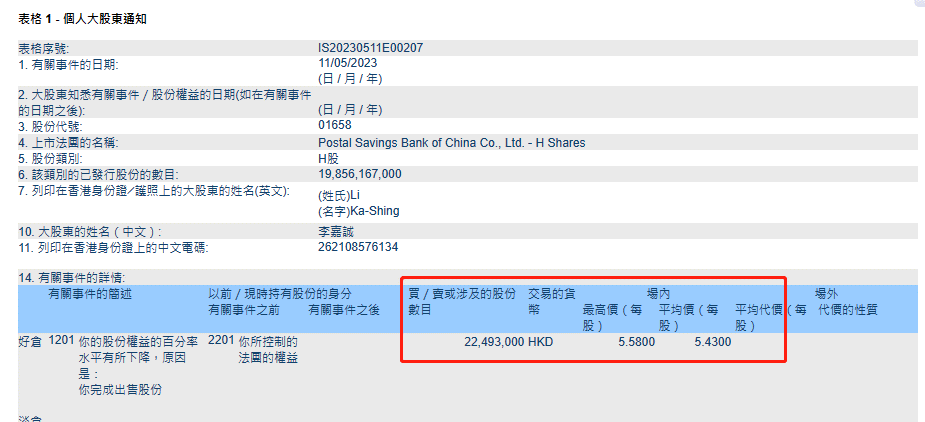 李嘉诚上一次减持是在去年9月29日,当日李嘉诚基金会以每股平均价4.71元,减持5万股,李嘉诚邮储银行H股权益降至10.99%或21.84亿股,意味李嘉诚在7个半月左右,减持2.04亿股邮储银行H股,以期间平均收市价4.77元推算,减持货值9.73亿元。