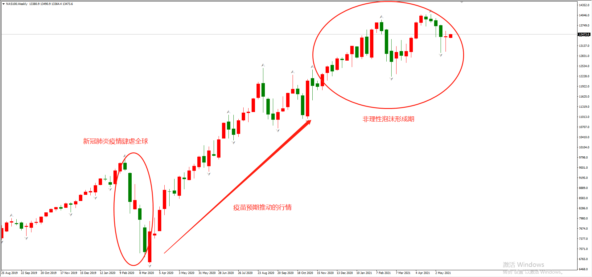 让我们把眼光放得更长远一些。经济数据、公投和大选,都有提前约定的具体时间点。比如非农数据每月第一周周五公布,英国公投时间在2016年6月23日、美国大选时间2020年11月3日公布。这些固定时点的事件,对于投资市场来说,所推动的行情往往相对有限,因为它们具有相对的确定性。只有在时间点上不确定的事件,才能够创造出持续性的大行情。比如,2020年3月份全球开始被新冠肺炎疫情袭扰,股票大跌、黄金大涨、原油跌到负值、美元指数一蹶不振。判断股票市场何时触底,就成为大型机构和所有个人交易者所努力的方向。不懂得“预期交易”的交易者会认为,在全球新冠肺炎疫情全部结束的时候,就是股市触底反弹的时候。这大错特错。等到那个时候,股票市场早就已经触顶,甚至已经开启新一轮的下跌。疫情所造成的恐慌,在什么时候会大幅衰减?新冠肺炎疫苗公布的时候。预期交易就是交易“新冠肺炎疫苗”的问世。在此之前,做多股票、原油、美元指数;在此之后,平仓以上三个品种。会有人问:“新冠肺炎疫苗问世之前,全世界还处在新馆的恐慌之下,怎么能够做多?”答案也很简单:利空出尽是利多。新馆肺炎疫情最严重的情况就是在全球泛滥,并且它已经严重泛滥,预期之内不会有更坏的事情发生,因为全球已经坏到了极致。事实也是这样,2020年3月份,纳斯达克指数跌至6627位置后,开启大涨走势,截至目前,已经触及14075高位,翻了一番有余。并且,辉瑞新冠肺炎疫苗的问世时间是在2020年11月份,那时候纳斯达克指数已经涨至12131,距离历史高点不远。选择疫苗研发成功后平仓的交易者(利多出尽是利空),可以获得绝大部分疫情所推动的行情。简单来说,预期交易的核心就是:及早布局、提前出场。