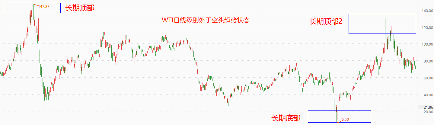 纯技术角度看,WTI日线级别处于空头趋势状态。2008年7月份至今,WTI呈现出强烈的周期波动特征:每当价格冲击130美元高位之后,就会进入强阻力区间,进而出现持续下跌;每当价格跌至30美元之下时,供应端(开采厂和炼油厂)大量歇业/倒闭,随后便开启升势。2022年3月份,WTI价格站上130美元关口,随后展开回落走势,并形成上图所示的长期顶部2。最新市价70.89美元/桶,就处于去年3月份至今的下跌态势之中。虽然从去年9月至今的震荡态势减缓了下跌力度,但空头趋势结构未变。在市场完全消化OPEC+减产和俄罗斯石油出口限制的消息后,大跌或将来临。
