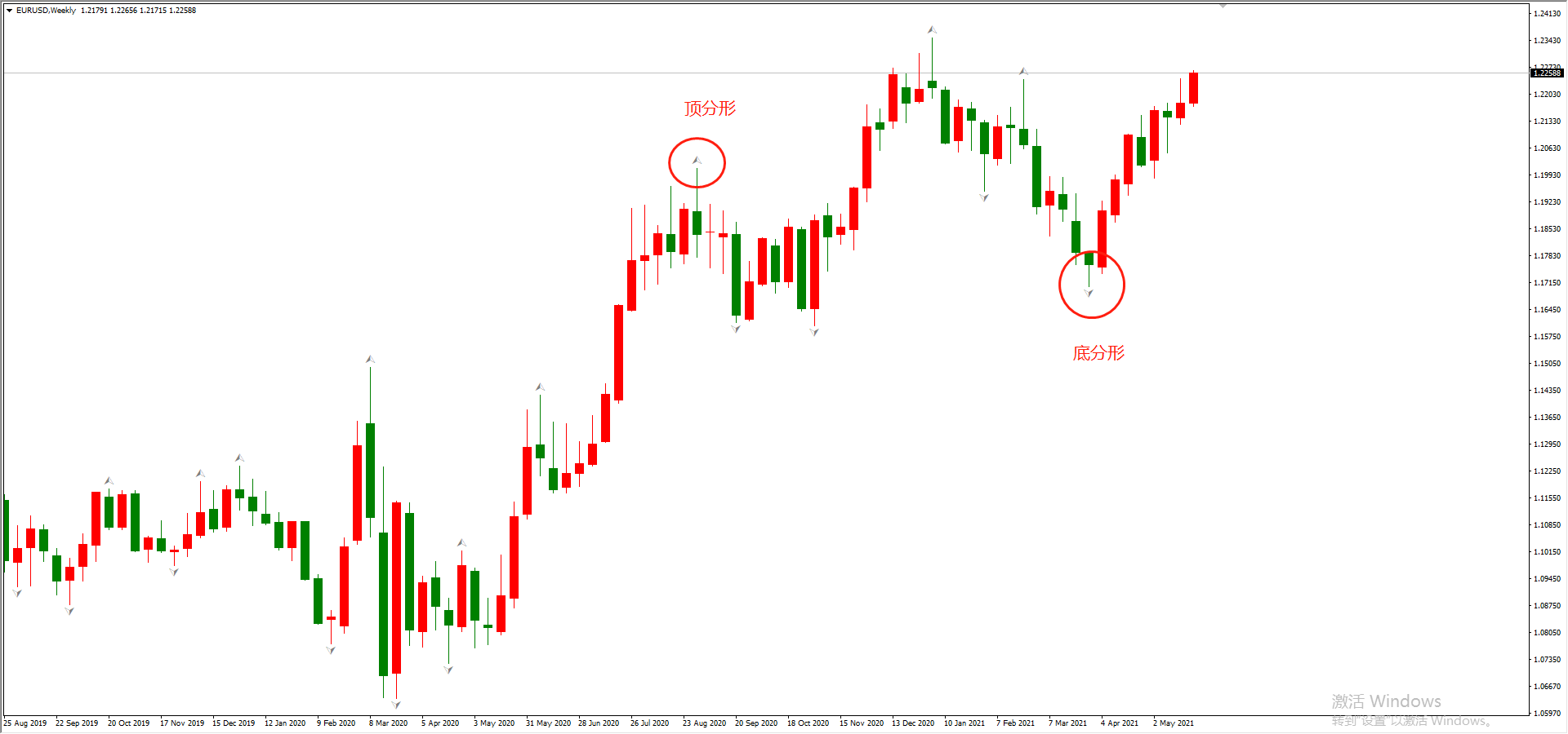 重要的阻力支撑位,笔者习惯使用分形指标来进行确认。有些人也会将分形指标叫做分型指标,后者来源于缠论。笔者所谓的分形与缠论的分型在K线数量要求上有所不同,所以命名上也有所差异。缠论讲分型指标由三根K线构成,笔者所讲分形指标由五根K线构成。如下图:
