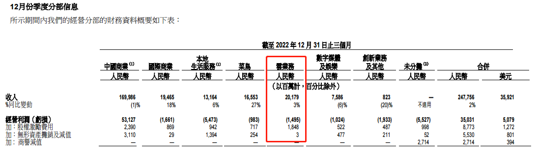 2022年第四季度,阿里巴巴云业务分部总收入(抵消跨分部交易的影响前)为人民币 266.93 亿元,当季总收入为2477.56亿元,云业务贡献比例为10.78%。在抵消跨分部交易的影响后的总收入同比增长3%至人民币 201.79 亿元(29.25 亿美元)。非互联网行业(主要由金融服务、教育及汽车行业构成)使用阿里云的比重为53%,贡献收入额同比增长9%。互联网行业贡献的云业务收入同比降低4%,主要因为某头部互联网客户逐渐停止于其国际业务使用阿里巴巴的海外云服务。整体看来,阿里云业务成长性较差,3%的增长不具备吸引力。