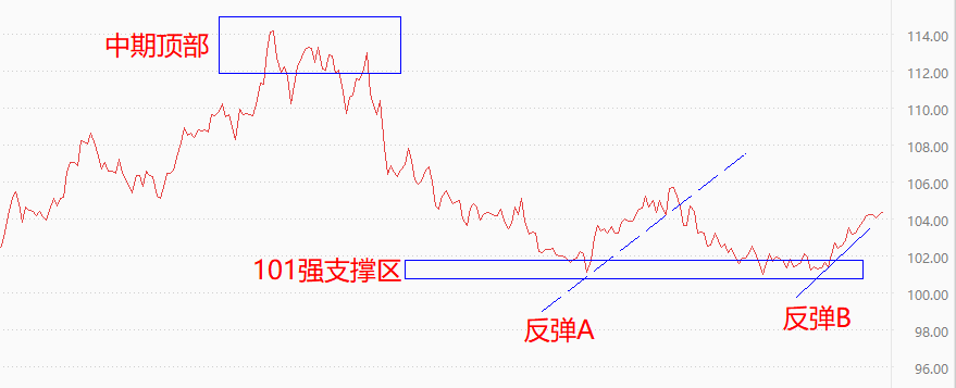 技术角度看,美元指数处于中期空头趋势下的反弹波段。2022年9月份形成中期高点,之后展开空头趋势。今年2月份展开一轮反弹,但并未改变空头趋势结构。4月13日展开第二轮反弹,美元指数从最低100.84一路上涨至当前的104.06。两轮反弹的支撑位均在101附近,意味着101是美元指数的强支撑区域。在反弹B趋势线被跌破之前,维持对美元指数的短多观点。