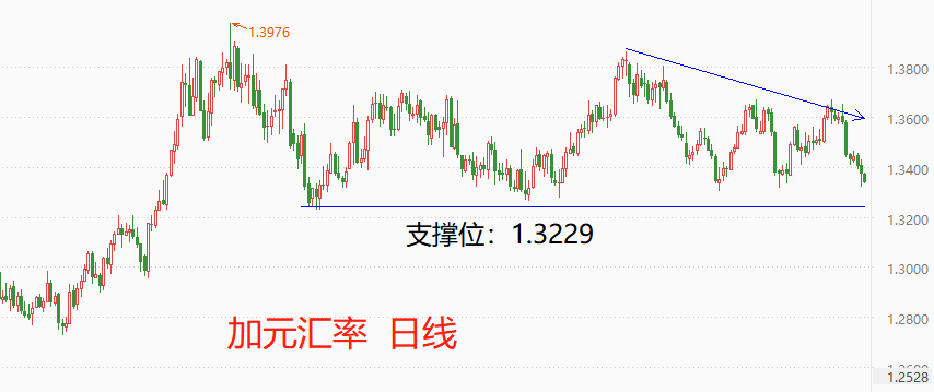 加拿大央行加息的消息公布后,加元升值0.23%,截至今日17:00,延续升值态势,最新价为1.3338。中期看,加元汇率处于宽幅震荡区间内,1.3229是区间下限。本周,加元呈现出由高到低的回落态势,市价距离支撑位1.3229越来越近,且跌势流畅。如果下周的美联储利率决议宣布维持基准利率不变,加元仍有升值可能,甚至会跌破支撑位。如果美联储意外加息,则处于相对弱势地位的加元将有可能贬值,汇率开启从支撑位向阻力位的震荡区间内运动。