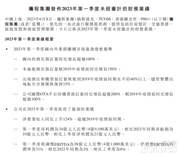 得益于旅游市场的复苏,携程今年一季度净营业收入2019年疫情前同期。出境酒店和机票预订量恢复到2019年疫情前同期水平的40%以上,公司国际OTA平台的机票预订量同比增长超过200%,较2019年疫情前按年增长超过100%。
