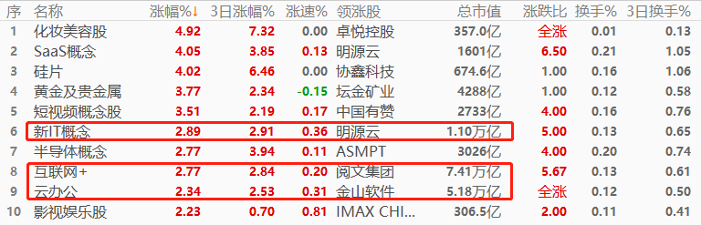 板块角度看,化妆美容股以4.92%的幅度领涨,其次是SaaS概念和硅片,三个板块总市值均在2000亿之下,对恒生指数的带动作用不强。涨幅榜前十中,超过万亿市值的板块有新IT概念、互联网+、云办公,均与互联网有关,故今日交易主线偏向大互联网概念。由于万亿市值板块仅有三席,且涨幅排名相对靠后,预计今日恒生指数或难有超预期涨幅。