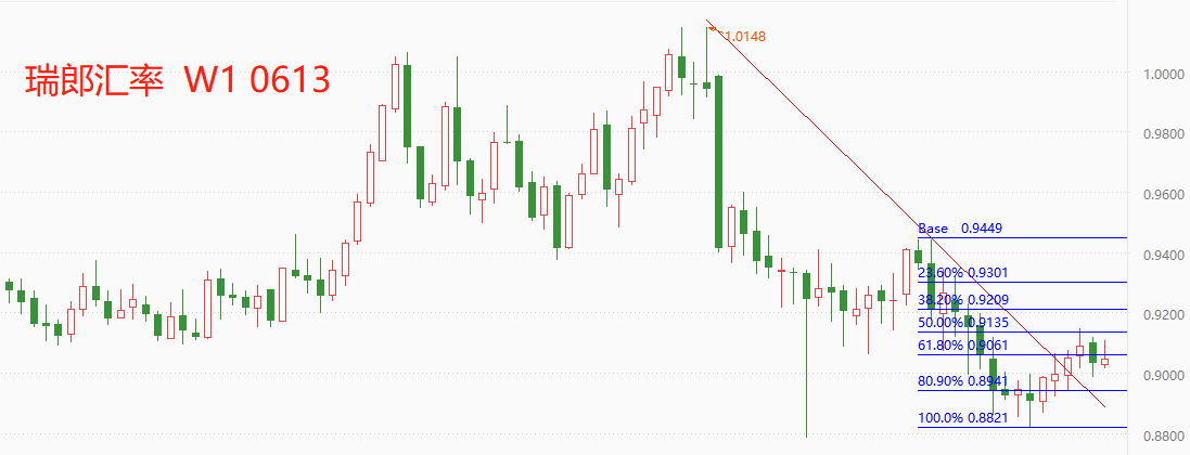 技术角度看,USDCHF处于长周期的震荡态势,中短期走势具有空头特征。2011年欧债危机以来,USDCHF波动上限为1.0320,下限为0.7000,十余年来没能突破该区间。瑞郎汇率最新市价0.9044,相对来说处于中上水平,具备持续回落的技术性动力。从最新的反弹波段看,反弹最高点达到0.5分位处,距离黄金分割0.618分位尚有一段距离,故反弹可能不会轻易结束。