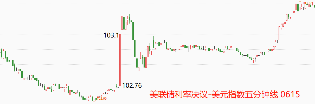 凌晨2:00,美联储宣布维持5.25%基准利率上限之后,美元指数5分钟级别走势迅速上涨,开盘102.76,5分钟后收盘至103.1,累计涨幅0.33%,这和市场所预期的“利空影响”矛盾。仔细观察发现,决议结果公布之前,美指持续下跌,最低达到102.66的全天最低位,这是由于市场预期到美联储将暂停加息而提前布局的结果。结果公布后美指大反弹,并不意味着暂停加息时利多消息,而是大量提前介入的资金平仓离场导致。经过多空激烈拉锯后,美元指数全天下跌0.29%,充分体现了美联储暂停加息的利空属性。
