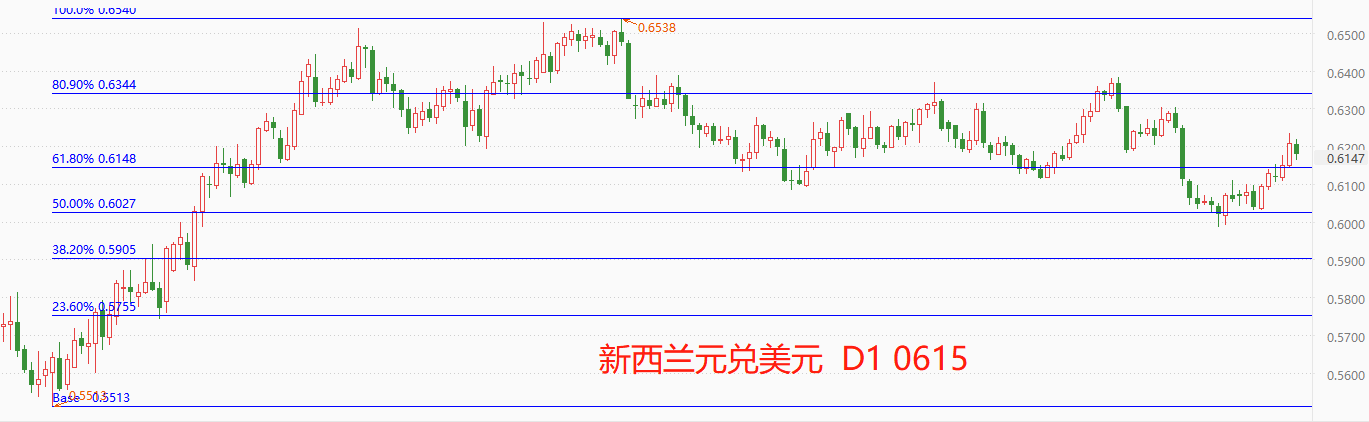 技术角度看,新西兰元正处于前期上涨后的回调阶段,尚未形成可靠底部结构。5月31日形成的最低点0.5985进入0.5~0.618重要分位区间内,但未触及0.618分位,故仍有回落空间。今年2月2日至今,回调持续时间长达四个多月,但累计跌幅仅为5.03%,具有缓慢回调特征。最新市价0.6178,短期阻力位0.6344,短期支撑位0.6027。