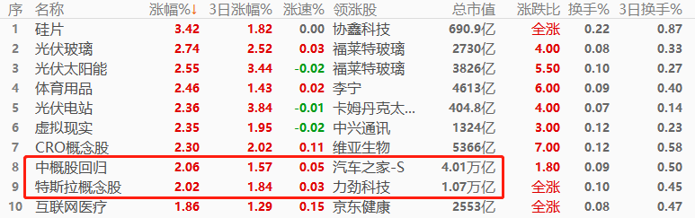 板块角度看,硅片以3.42%的幅度领涨,其次是光伏玻璃和光伏太阳能,三个板块总市值均不足万亿,对恒生指数的带动作用不强。涨幅榜前十中,超过万亿市值的板块有两个,占比较低,意味着今日中小盘股表现将整体优于大盘股。涨幅榜当中,与“光伏”相关的板块有五席,成为进入交易主线。