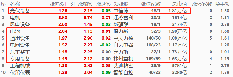 A股市场,光伏设备以4.26%幅度领涨,其次是电机和风电设备,其中光伏设备的总市值超万亿,其涨势对股票指数提振作用极强。涨幅榜前十当中,万亿市值板块占6席,权重板块总数较多,预计今日上证指数、深证成指涨势将延续。涨幅榜当中,与“电”概念关联的板块有7席,形成今日交易主线。