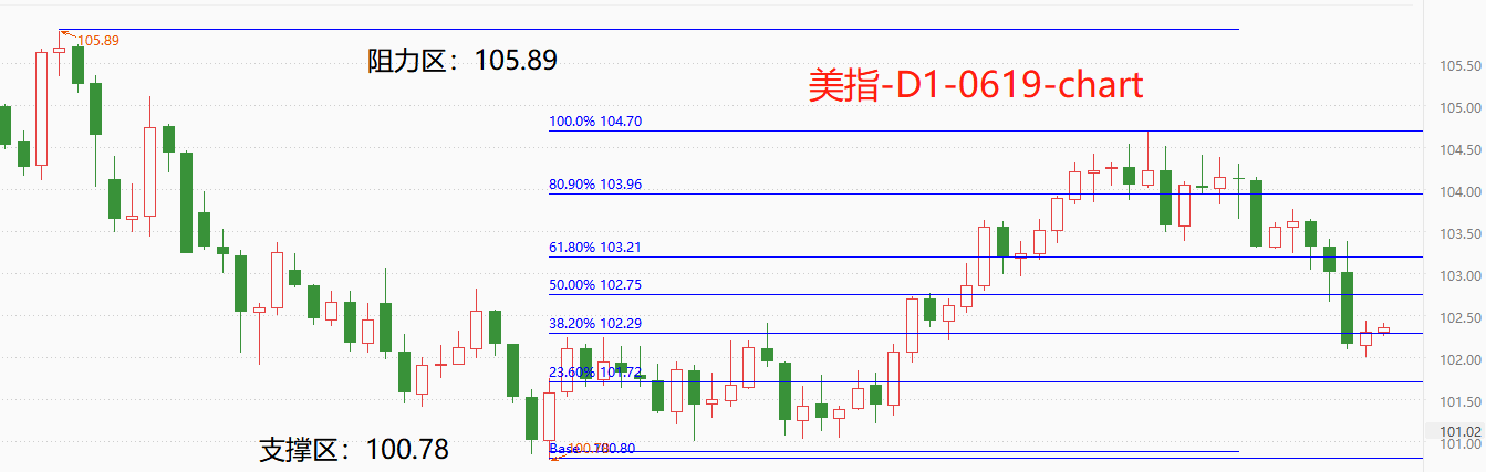 长周期角度看,美元指数在2022年9月份触及高点114.79,已经完成了一轮升值周期,接下来将进入漫长的贬值周期。短周期角度看,美元指数走势的空头特征极为显著,5月31日至今,累计下跌幅度达到1.61%,预计本周将延续跌势。市价102.36,运行于0.618分位处,技术角度看,存在反弹的可能性。短线支撑位101.72,短线阻力位102.75点。
