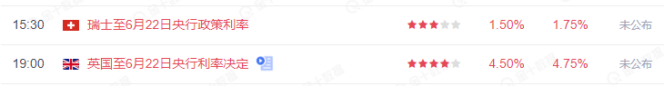 英国央行利率决议将将于本周四19:00公布,市场预期将加息25基点,基准利率升高至4.75%;瑞士央行利率决议将于本周四15:30公布,市场预期将加息25基点,基准利率升高至1.75%。由于欧央行已经在上周宣布加息25基点,所以英国央行和瑞士央行的加息结果没有太大悬念。另外,英国央行本次利率决议只有会议纪要发布,没有新闻发布会。