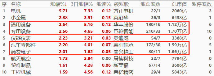 A股市场,电机以5.71%的幅度领涨,其次是小金属和通用设备,涨幅榜前三中仅有通用设备总市值超万亿,预计对上证指数和深证成指的带动作用不足。涨幅榜前十当中,万亿市值板块总计4席,权重板块总数未过半,A股下午盘扭转颓势的可能性不高。涨幅榜当中,与“动力电池”相关的板块占7席,形成今日交易主线。