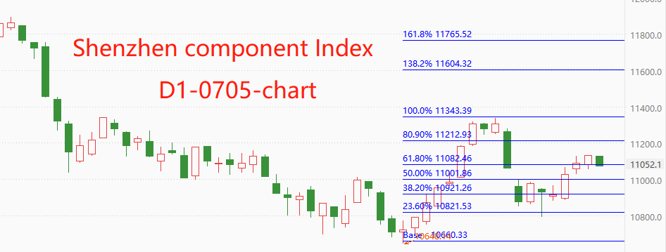 技术角度看,深证成指的反弹结构稳固,今日虽然下跌,但本周整体延续涨势的概率较高。6月21日至28日的下跌波段,最低触及0.864分位,已经充分回调,未来极有可能触及“回撤勾形”最高点11338点。深证成指的代表性个股有宁德时代、比亚迪,属于“新能源汽车”板块,具有高景气度。行业内龙头个股特斯拉的二季度业绩表现亮眼,股涨幅较大,预计将会对深证成指的“新能源汽车”板块走势形成提振。