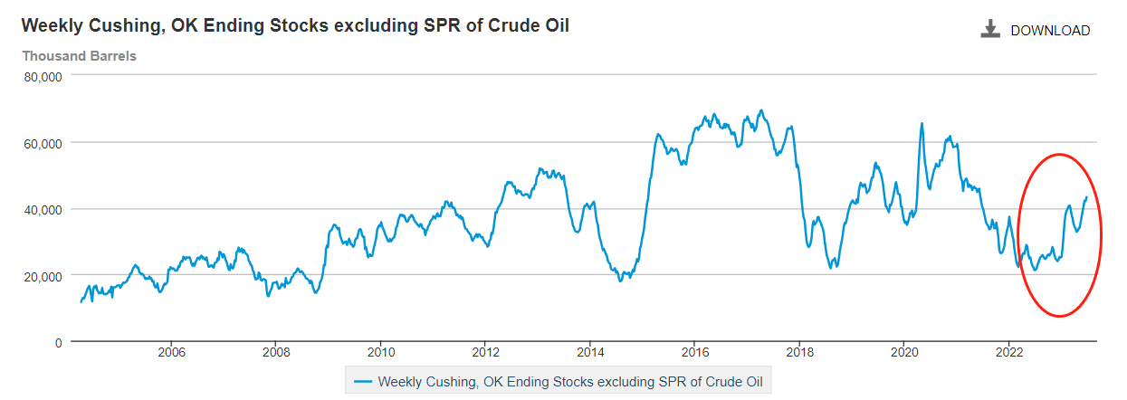 之所以OPEC和俄罗斯的减产消息无法彻底扭转原油的跌势,是因为EIA原油库存曲线没有因为减产而下降,反而在加速上升。2022年年中,库欣地区的原油库存低至2100万桶左右,处于历史低位库存区间。本月最新库存4324.4万桶,相比去年年中已经翻两倍由于,库存水平正稳步回升。大宗商品的价格对库存变动极为敏感,库存升高,价格往往承压。