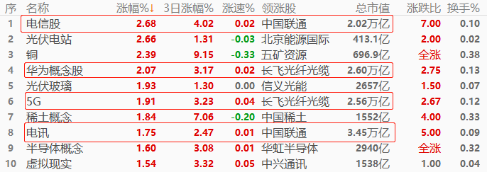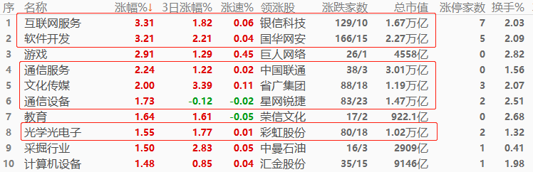 A股市场,互联网幅度以3.31%的幅度领涨,其次是软件开发和游戏。涨幅榜前十中,总市值超过万亿的占6席,占比较多,且普遍涨幅较大,对沪指的带动作用较强。涨幅榜当中,与“互联网”相关的板块占6席,形成今日交易主线。A股三大权重板块:银行、酿酒行业、半导体的涨跌幅分别为+0.39%、-0.9%、0.28%,涨跌互现、涨幅偏低,较难形成合力。领涨个股中,中国联通在A股和港股市场均领涨电信板块。一季度财报显示,中国联通营收972.2亿元,同比增长9.21%;归母净利润22.66亿,同比增长11.56%。营收与净利双双大增,业绩前景良好。
