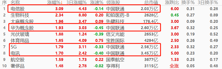 板块角度看(上周五),电信板块以3.09%的幅度领涨,其次是生物科技和大麻概念股。涨幅榜前十当中,万亿市值板块占4席,数量较少,对指数的带动作用不强。涨幅榜当中,与“电信”相关的板块占4席,形成近期交易主线。港股三大权重板块:银行、互联网、房地产的涨跌幅分别为+0.62%、-0.28%、0.13%,涨跌不一,且上涨板块的幅度偏小,较难形成合力。领涨个股中,中国联通出现4次表现最为亮眼,值得持续关注。