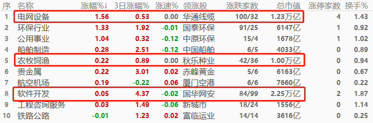 A股市场,电网设备以1.56%的幅度领涨,其次是环保行业和公用事业。涨幅榜前十中,总市值超过万亿的占3席,占比较低,且普遍涨幅较小,对沪指的带动作用较弱。涨幅榜当中,与“公用事业”相关的板块占4席,形成今日交易主线。A股三大权重板块:银行、酿酒行业、半导体的涨跌幅分别为-0.66%、-1.45%、-1.2%,普跌且跌幅大部分在1%以上,对沪指形成严重拖累。