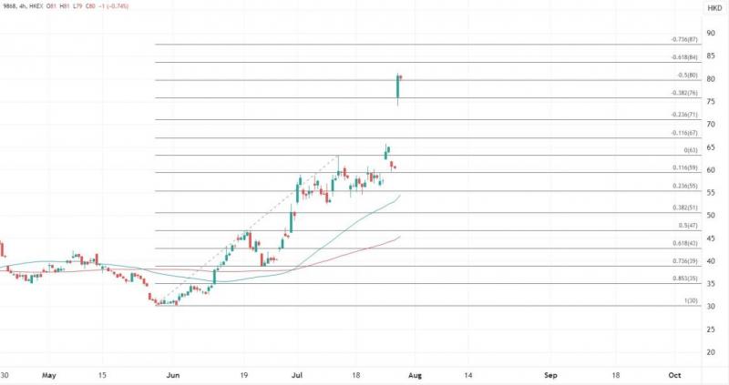 小鹏汽车(09868)股价经过今日的大涨,需要关注80港元上方的阻力,如果可以跟进进一步上望85港元技术上将确认进入更高区间。但如果放缓回落,预计将调整至70港元下方。