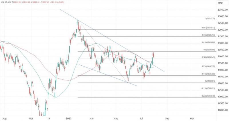 ATFX港股:隔夜反映中概股表现的金龙中国指数亦录两连涨,今早公布的中国7月财新制造业PMI逊于预期,恒指三日累涨逾七百点后,今早高开逾百点但冲高回落,午后跳水转跌,失守两万点关口。