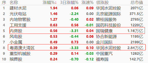 板块角度看,建材水泥以1.94%的幅度领涨,其次是光伏电站和内地物管股。涨幅榜前十当中,万亿市值板块占2席,数量较少,对指数的带动作用不强。与“楼市”相关的板块有4席,成为今日交易主线。港股三大权重板块:银行、互联网、房地产的涨跌幅分别为-1.49%、-1.79%、0.16%,普跌且跌幅较大,对恒指形成拖累。领涨个股中,华润水泥控股出现2次,表现最为凸出,值得持续关注。